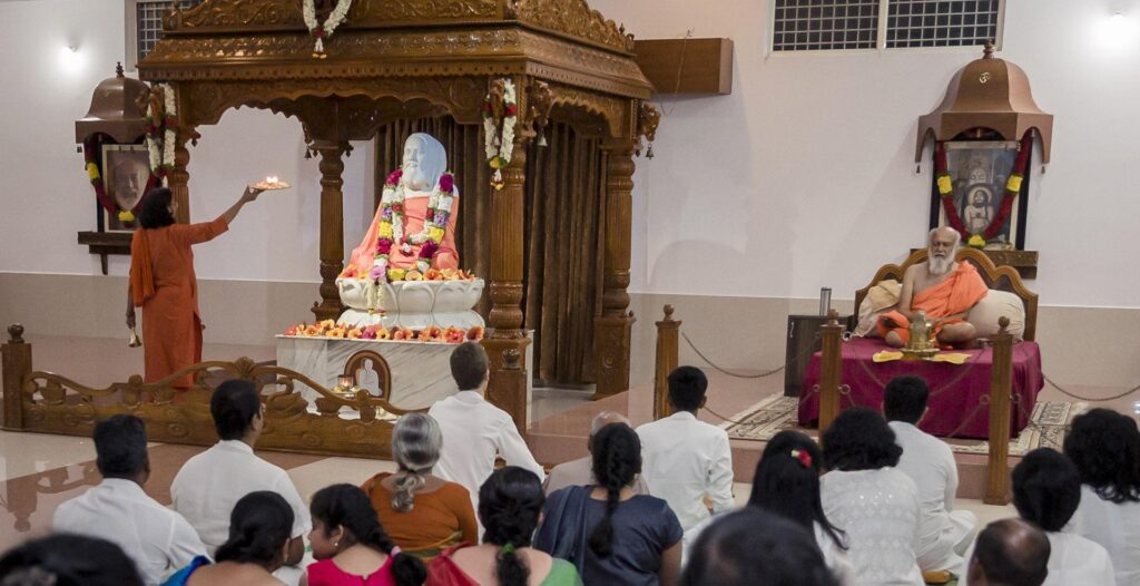 Exactly five days later, during the evening aarathi at the Ashram, Seenu once again beheld the living presence of his Guru. Before his eyes, Swamiji manifested from the very image placed upon the Guru’s seat.