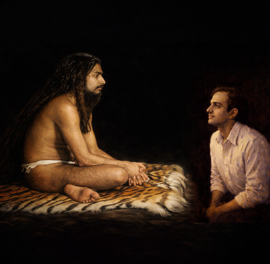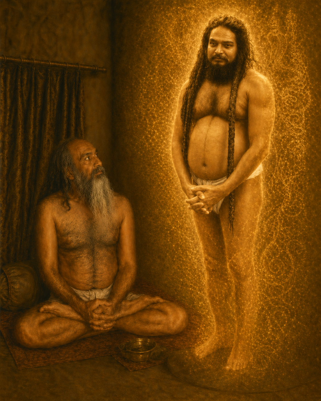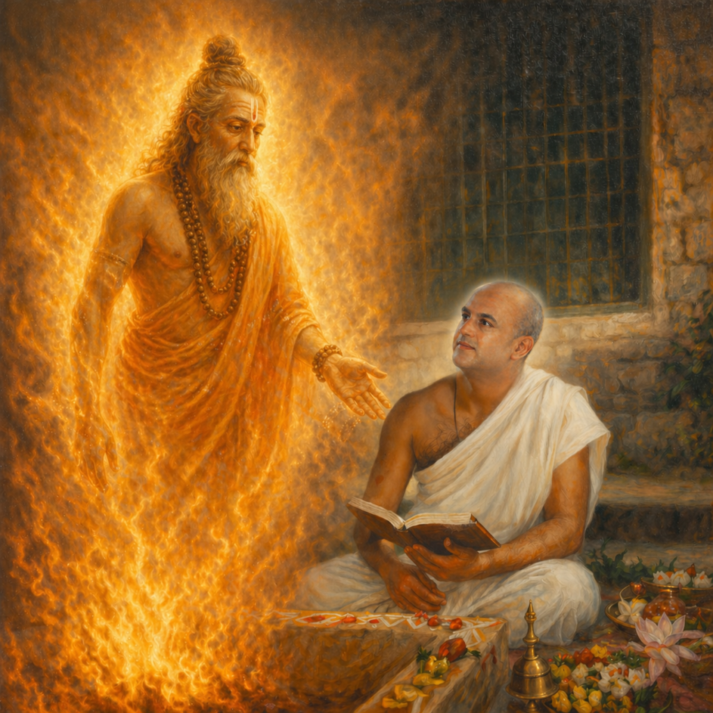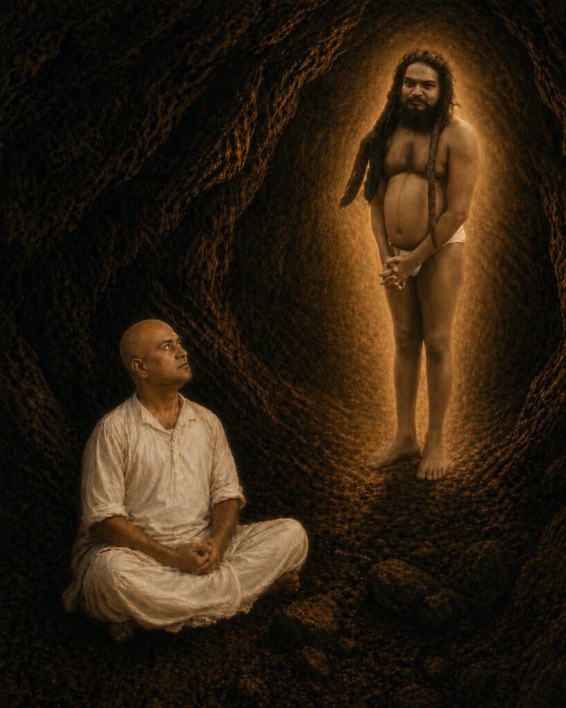 At length, he became aware of a presence and was gently brought out of meditation by a sound nearby. Opening his eyes, he beheld a radiant and dazzling vision—his Guru, standing before him, surrounded by a luminous glow.