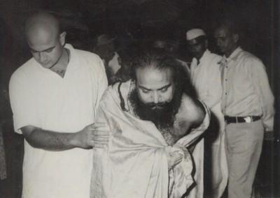 Unsure whether the experience had been a true Divine vision or a manifestation of His mind’s grief at the physical passing of His Guru, Seenu returned to the Dehradun Ashram and continued His service there. He felt that if it was truly a Divine vision then its import would become clear in time. Carrying on His work thus, it was later in that same year one evening as He was completeing the evening worship at the Ashram that He suddenly beheld again His Guru manifesting before Him. Swamiji touched Him between the eyebrows and led Him to a room adjacent to the meditation hall.